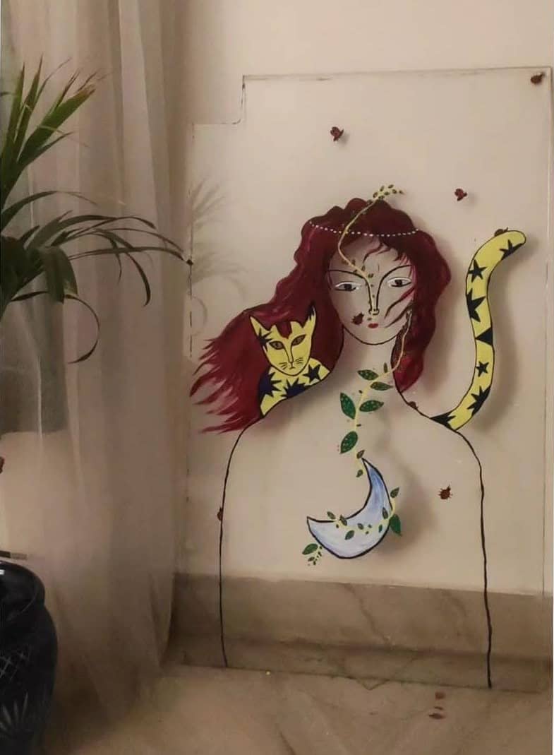 While installing this window AC, a glass pane was removed from the window. A friend and I drew on it a magical, mystical, womanly figure staring coldly into the distance. A feline, starry-bodied creature wrapped around their neck. A half-moon hung out, emerging from their body.